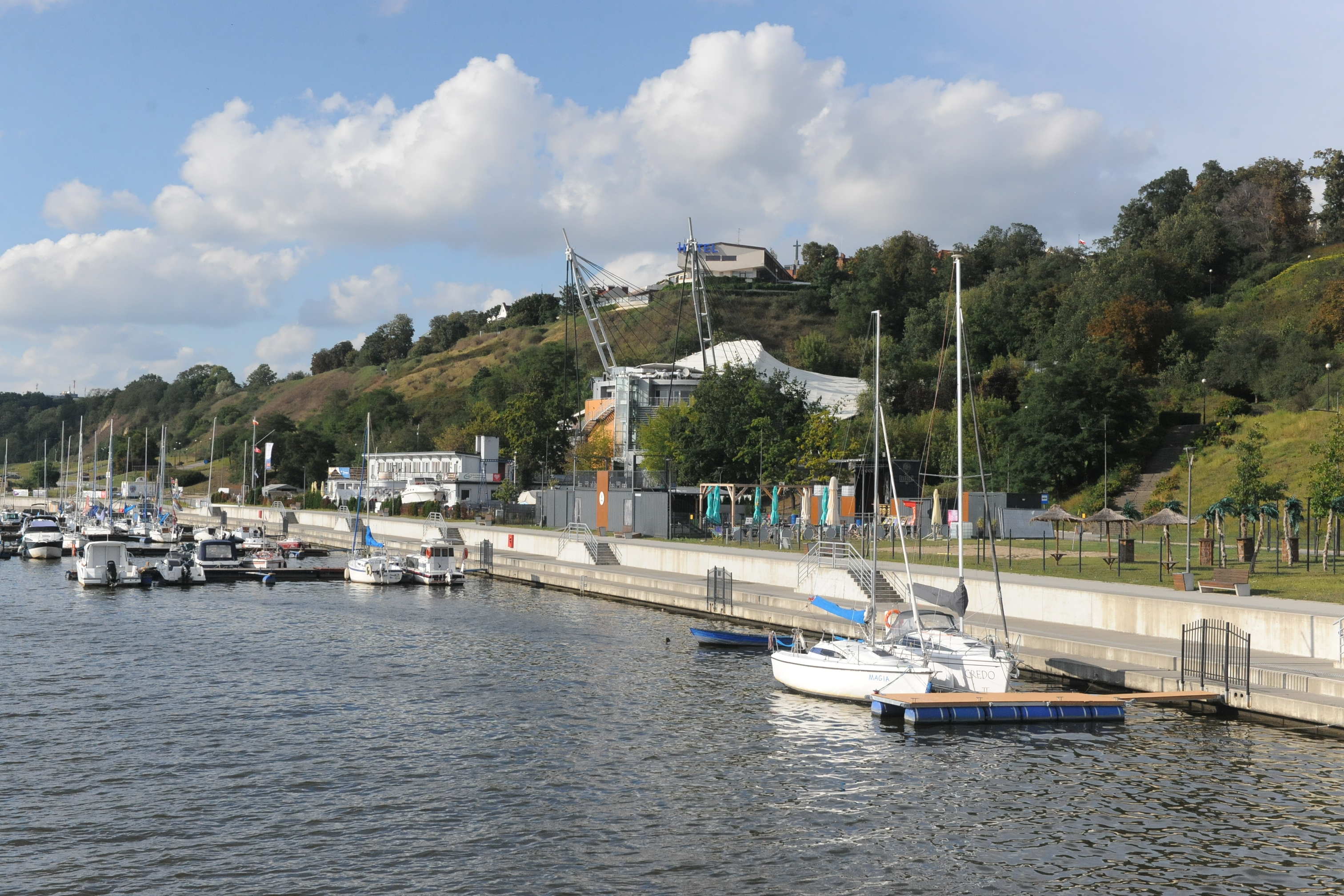 Grupa ludzi pozująca na tarasie z widokiem na rzekę. W tle most i zabytkowy budynek w otoczeniu zieleni. Niebo częściowo zachmurzone.