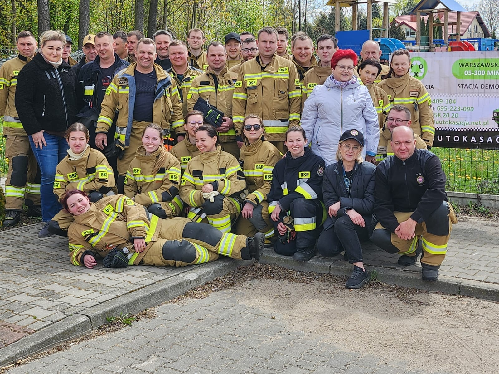 Grupa ludzi w strojach strażackich stoi na tle lasu. Na pierwszym planie są dwa banery reklamowe z autami. Tło to niebo z chmurami i drzewa.