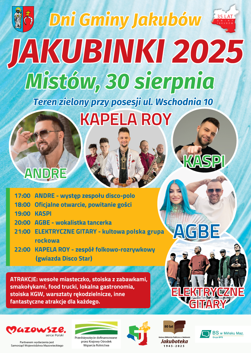 Gmina Jakubów serdecznie zaprasza mieszkańców oraz gości na wyjątkowe wydarzenie – Jakubinki 2025, które odbędą się 30 sierpnia (sobota) na zielonym terenie przy posesji ul. Wschodnia 10 w Mistowie. Tegoroczna edycja będzie szczególna, ponieważ świętujemy 35-lecie Gminy Jakubów!
