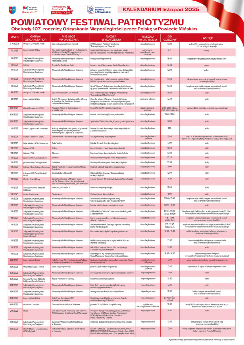 Powiatowe Centrum Kultury i Aktywności w Mińsku Mazowieckim przygotowało dla Was listopadowe zestawienie wydarzeń, które odbędą się w naszym powiecie. To miesiąc pełen kultury, sportu i patriotycznych emocji.