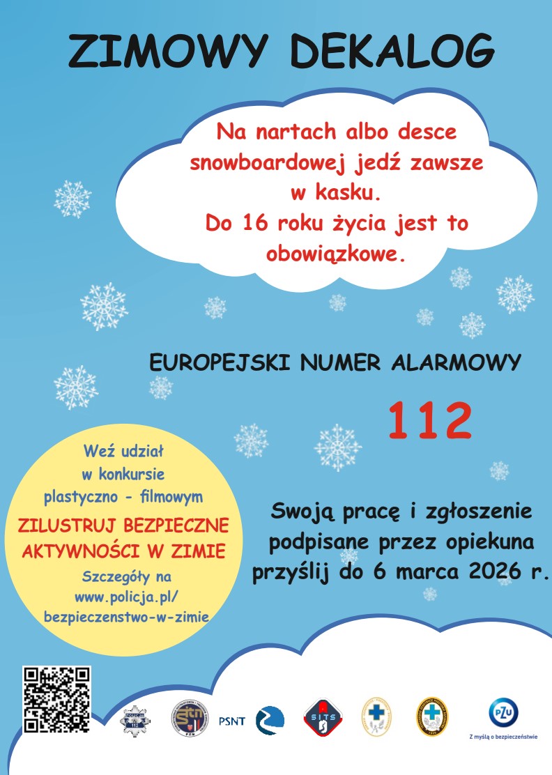 Zachęcamy wszystkich do wzięcia udziału w konkursie plastyczno-filmowym na zilustrowanie bezpiecznych zachowań w tym rekreacji i aktywności fizycznej podczas całego sezonu zimowego pod nazwą „Zimowy Dekalog”. Konkurs adresowany jest do dzieci i młodzieży. Organizatorem konkursu jest Biuro Prewencji Komendy Głównej Policji wspólnie z Partnerami.