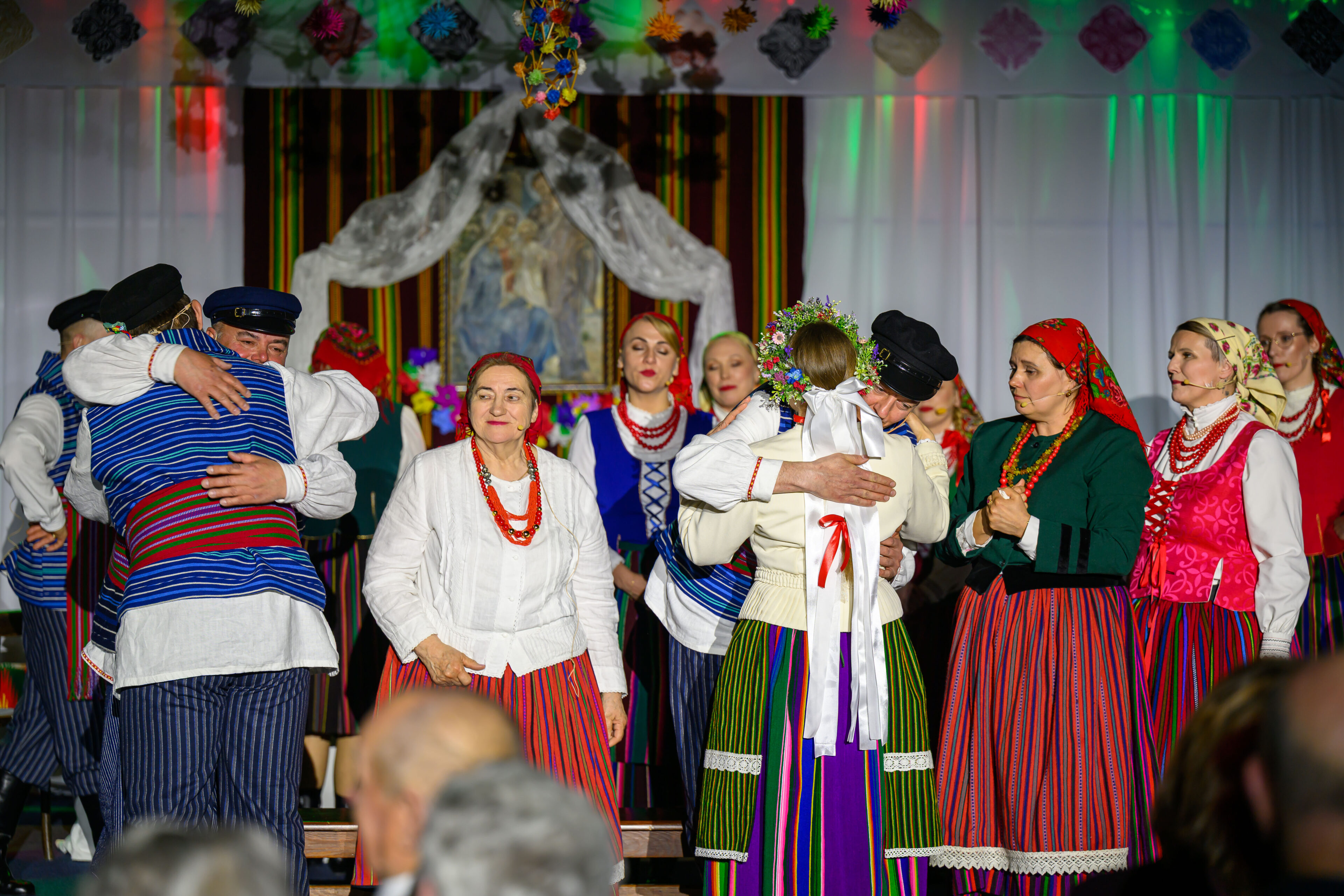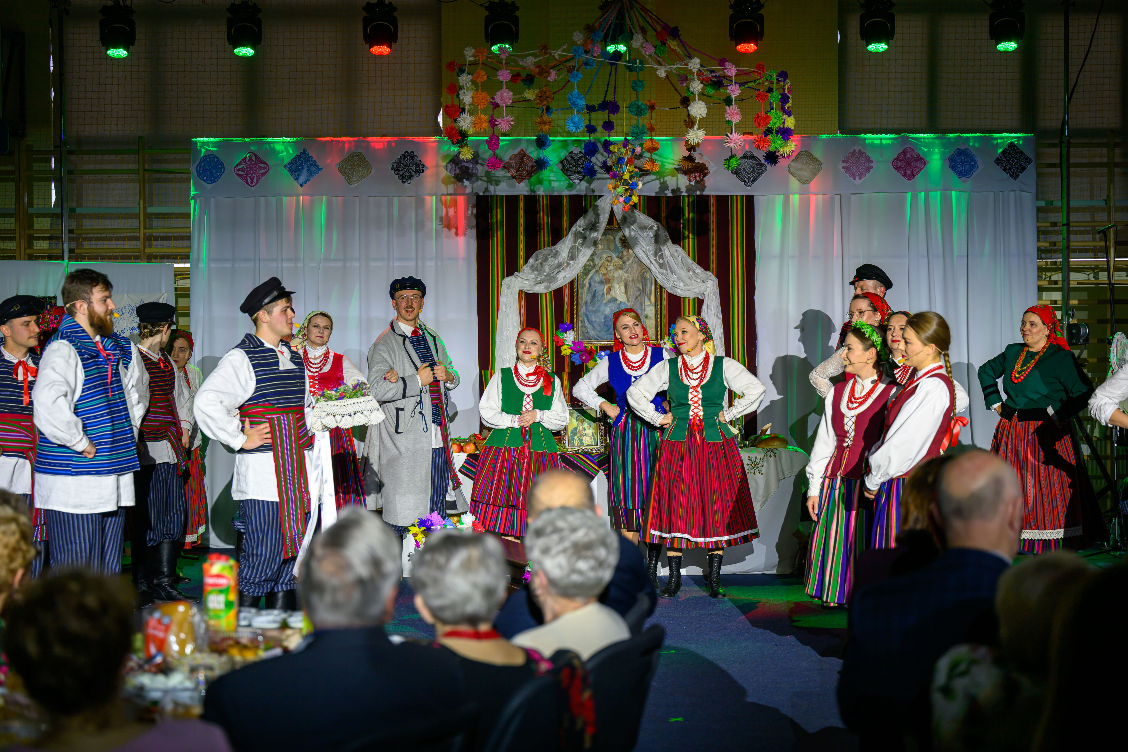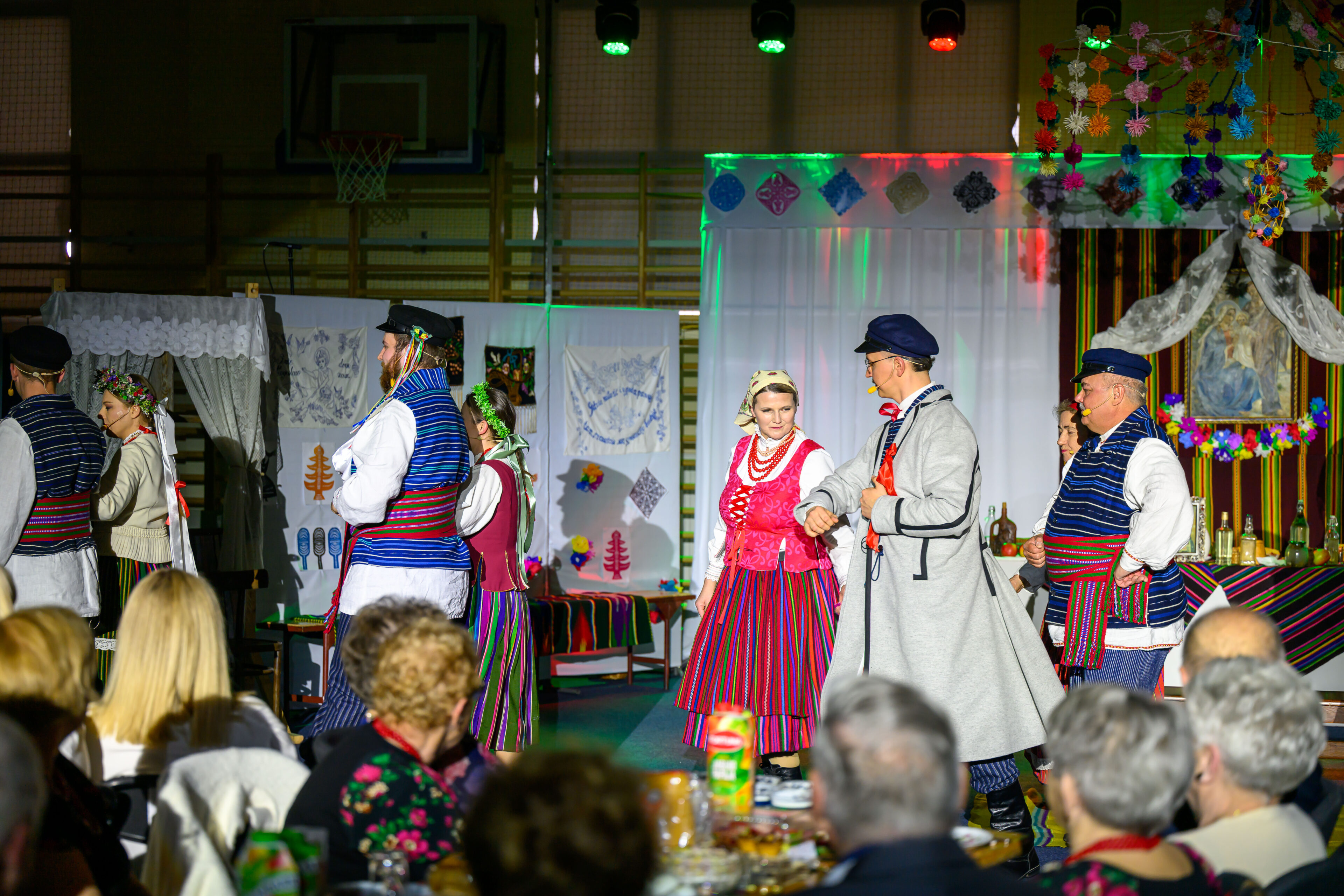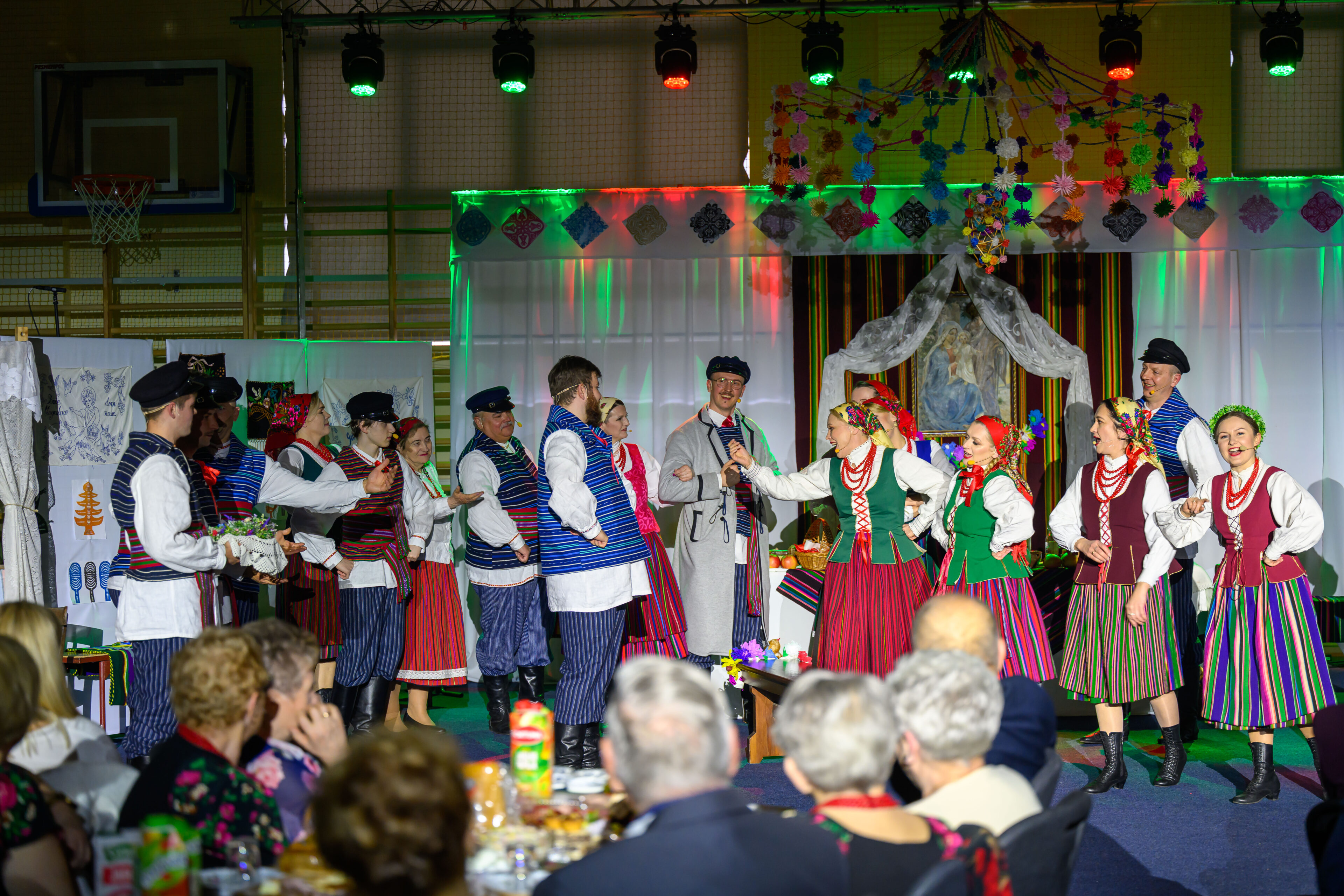 Spektakl przeniósł widzów w czasy dawnych, dziś już rzadko spotykanych obrzędów weselnych. Artyści w barwny i autentyczny sposób zaprezentowali kolejne etapy tradycyjnego wesela – od przygotowań, przez ceremonię, aż po wspólne świętowanie. Nie zabrakło ludowych strojów, przyśpiewek oraz charakterystycznych zwyczajów, które niegdyś stanowiły ważny element życia społecznego regionu.