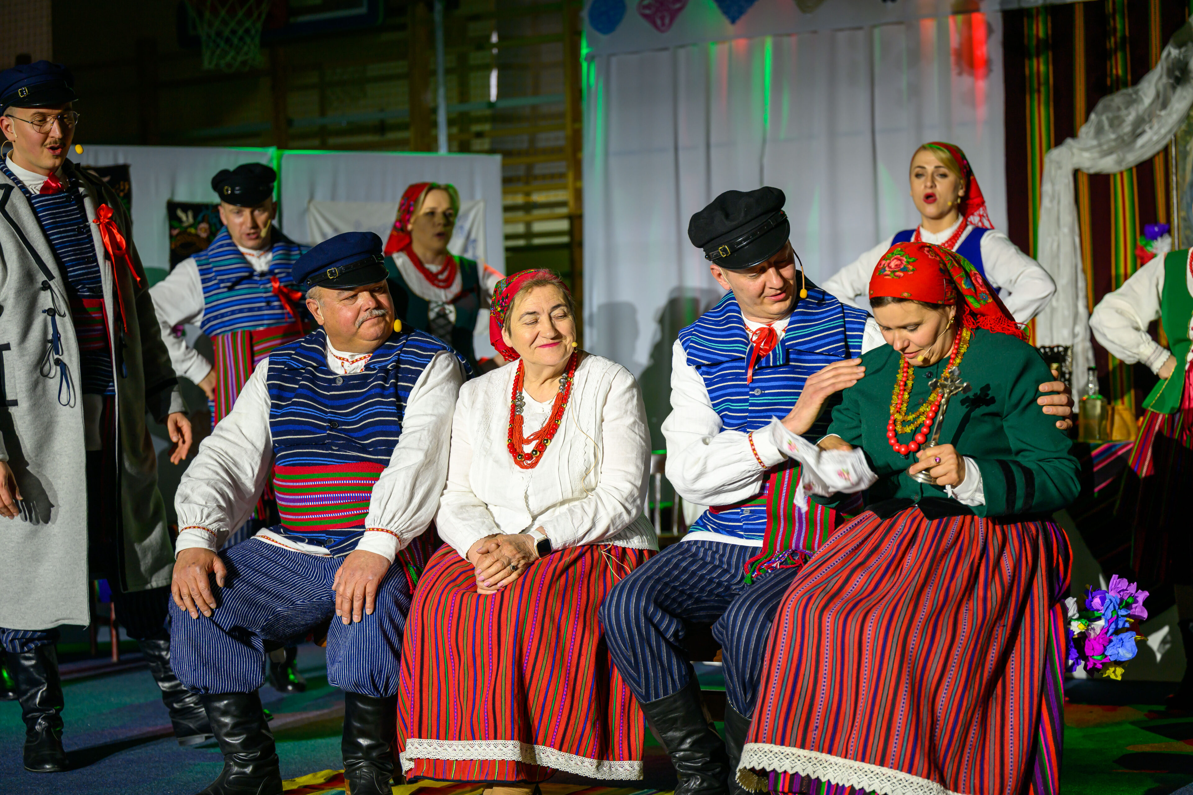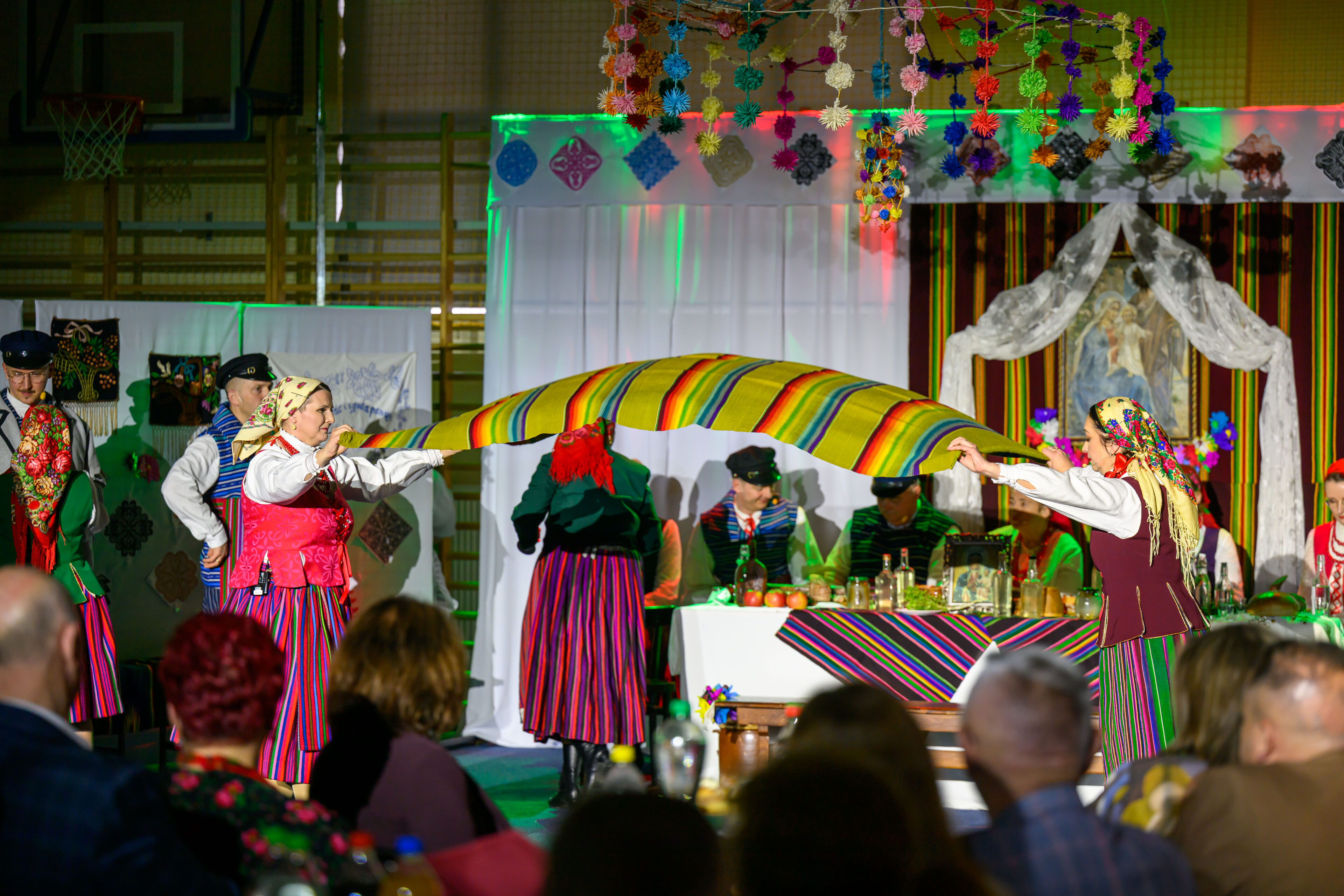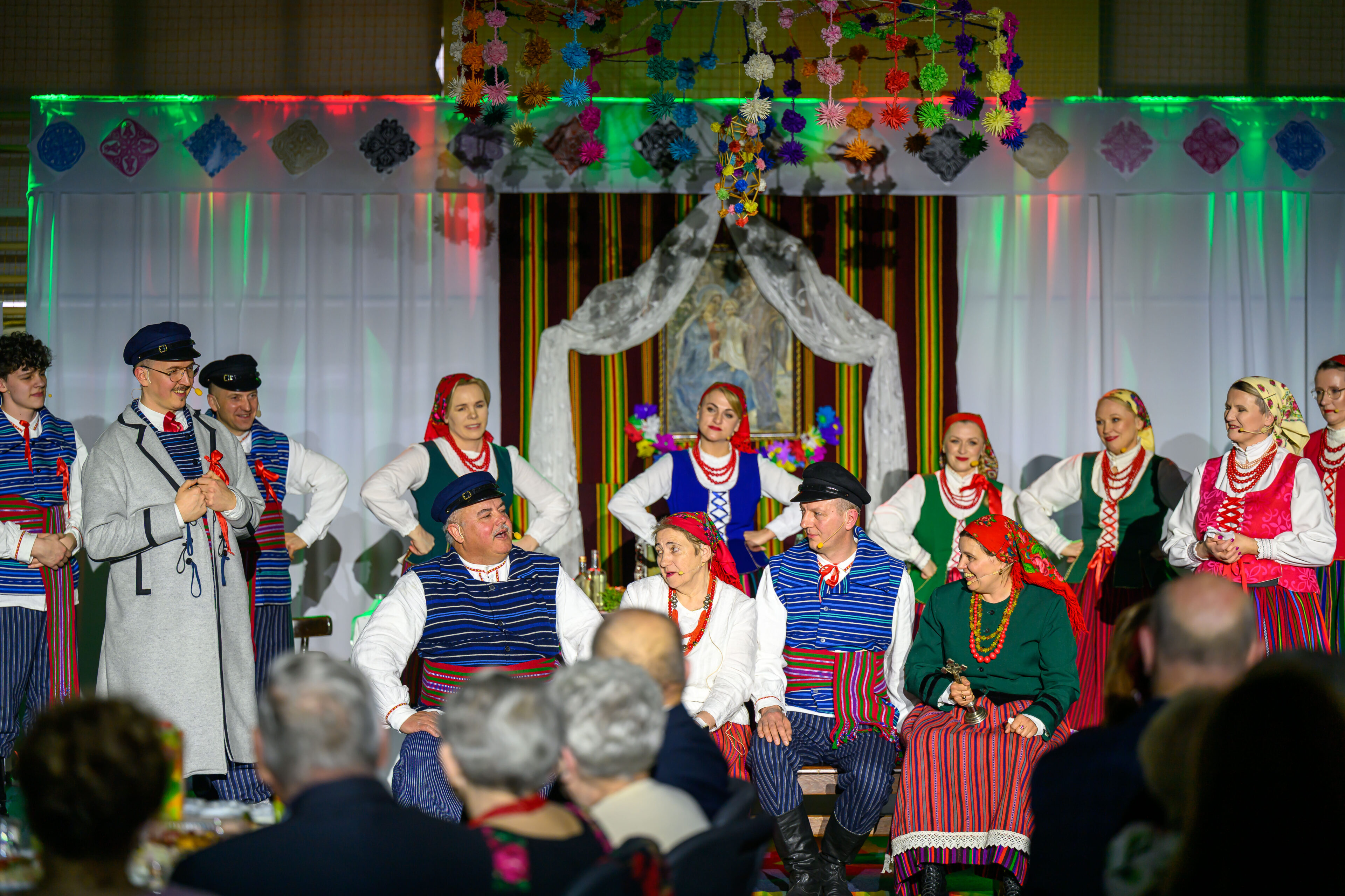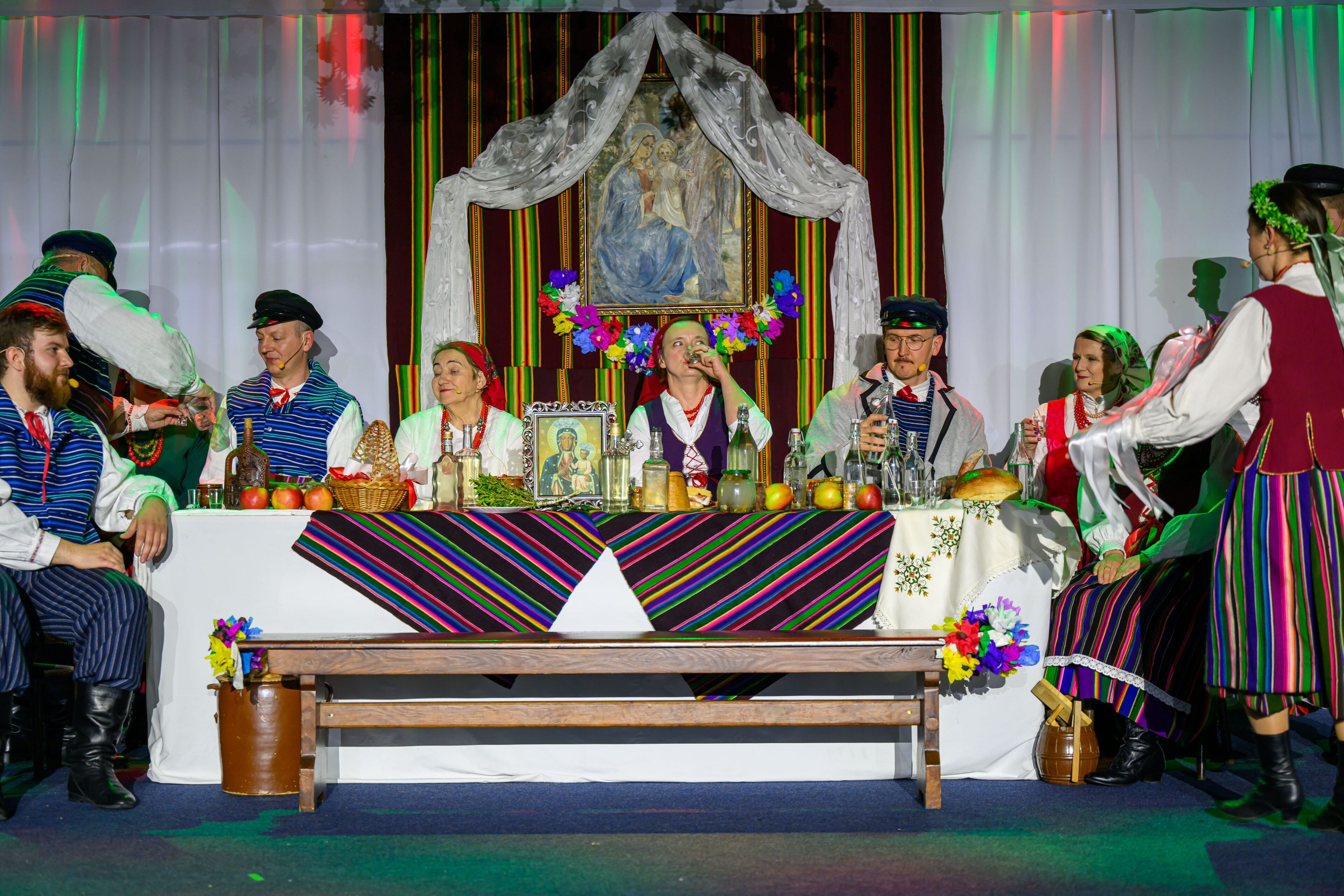 Spektakl przeniósł widzów w czasy dawnych, dziś już rzadko spotykanych obrzędów weselnych. Artyści w barwny i autentyczny sposób zaprezentowali kolejne etapy tradycyjnego wesela – od przygotowań, przez ceremonię, aż po wspólne świętowanie. Nie zabrakło ludowych strojów, przyśpiewek oraz charakterystycznych zwyczajów, które niegdyś stanowiły ważny element życia społecznego regionu.