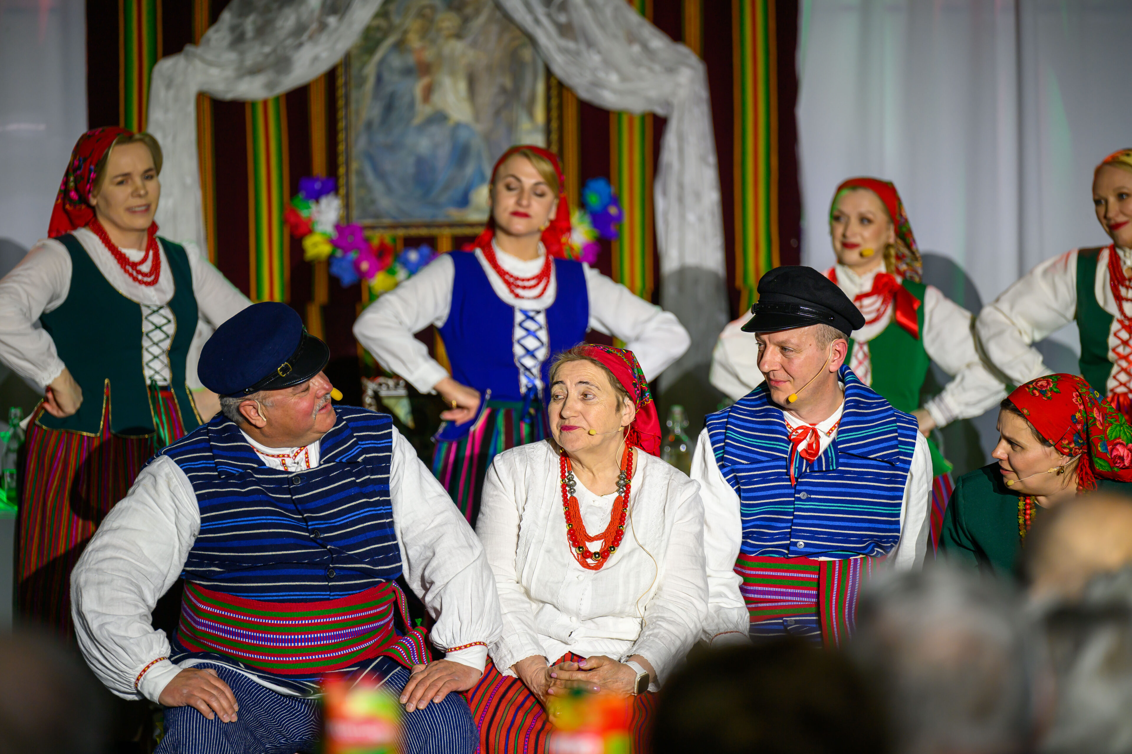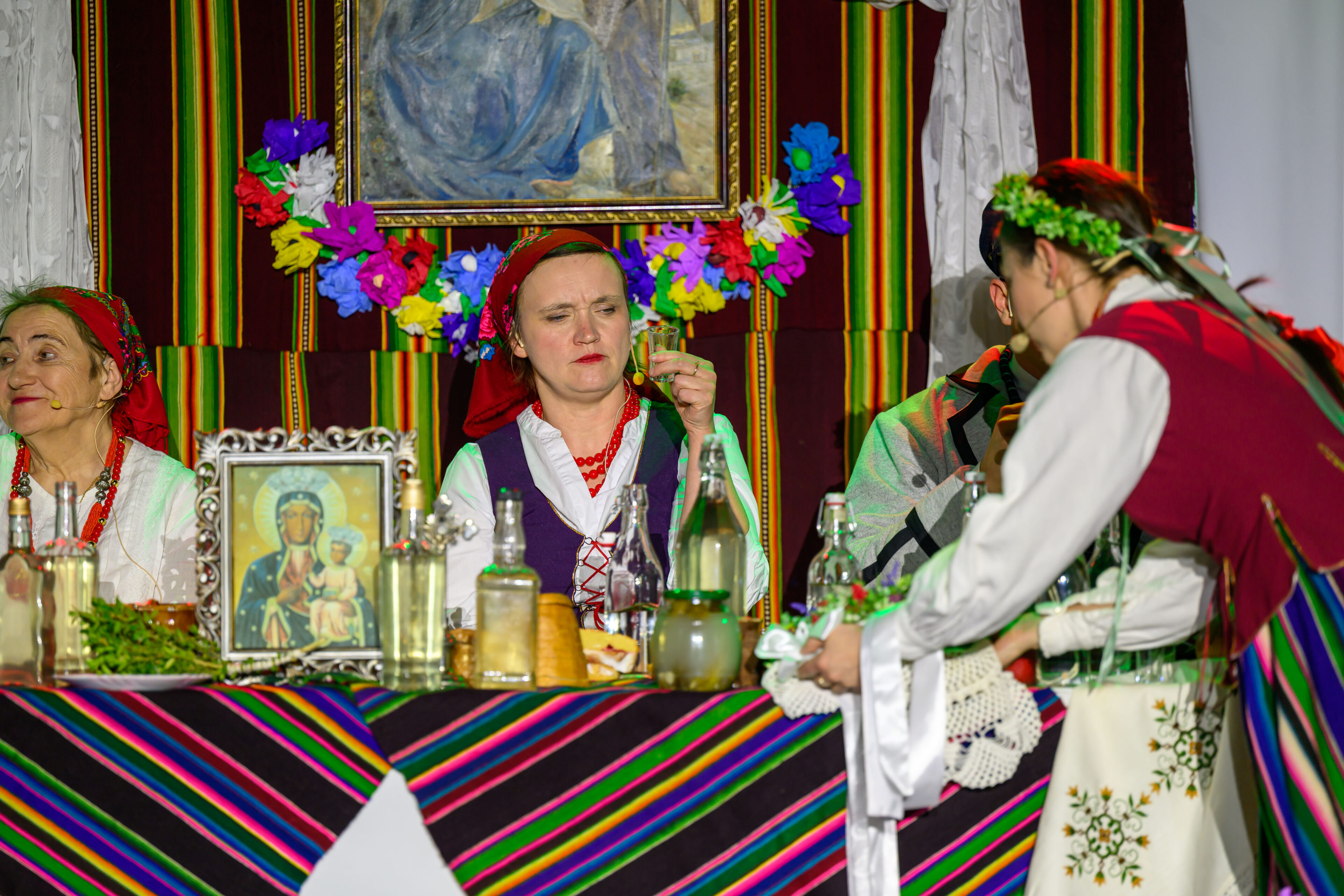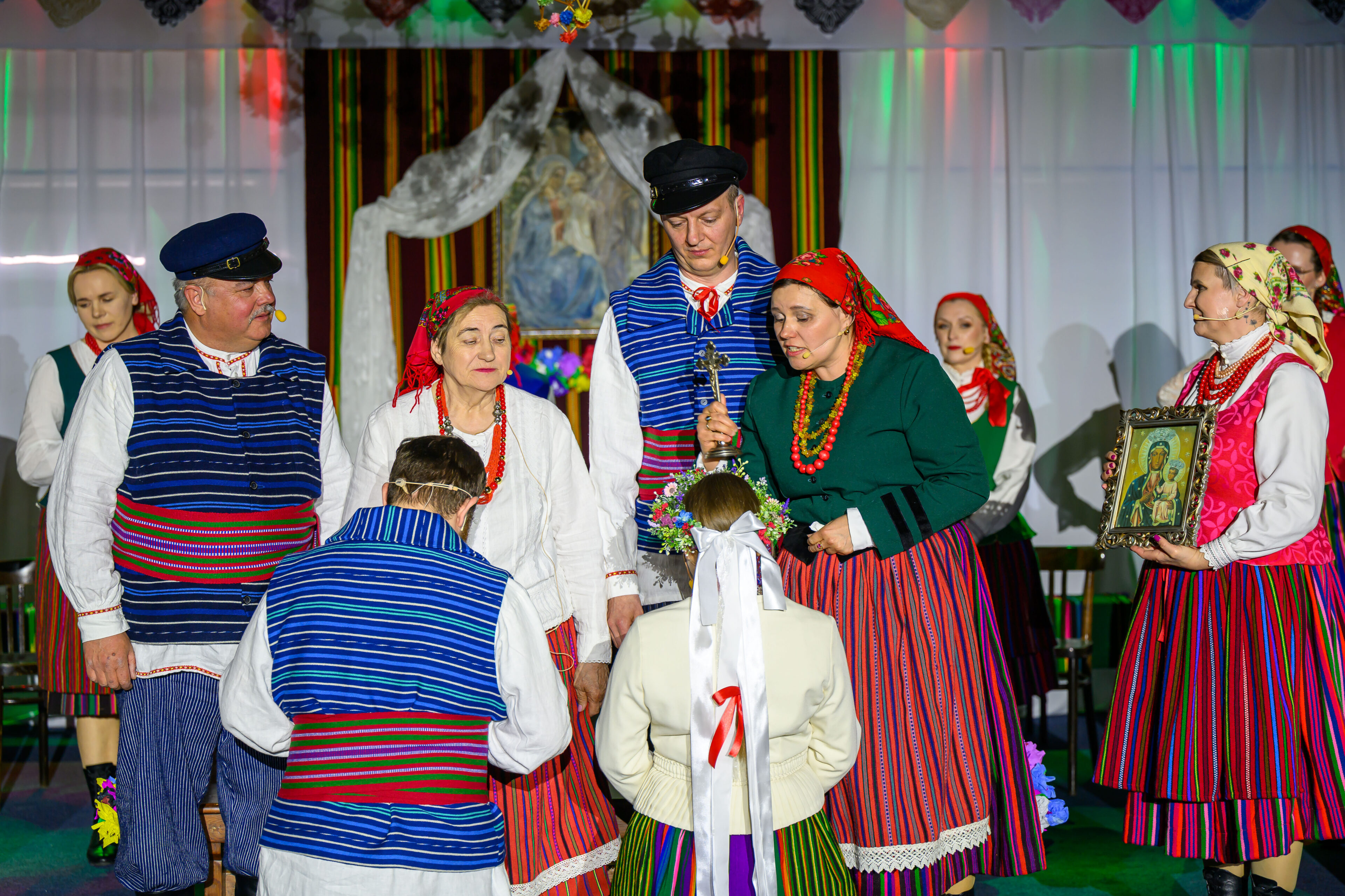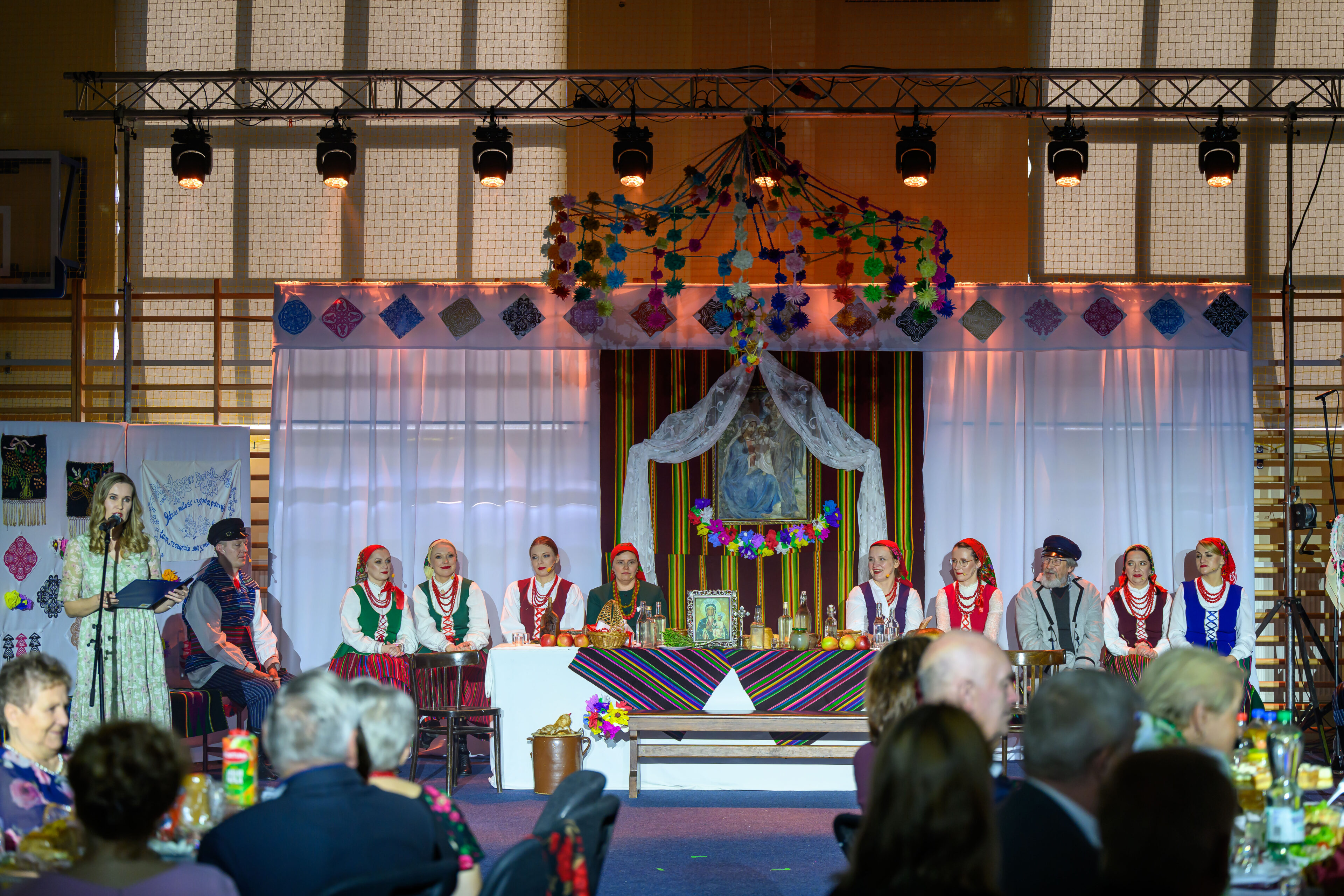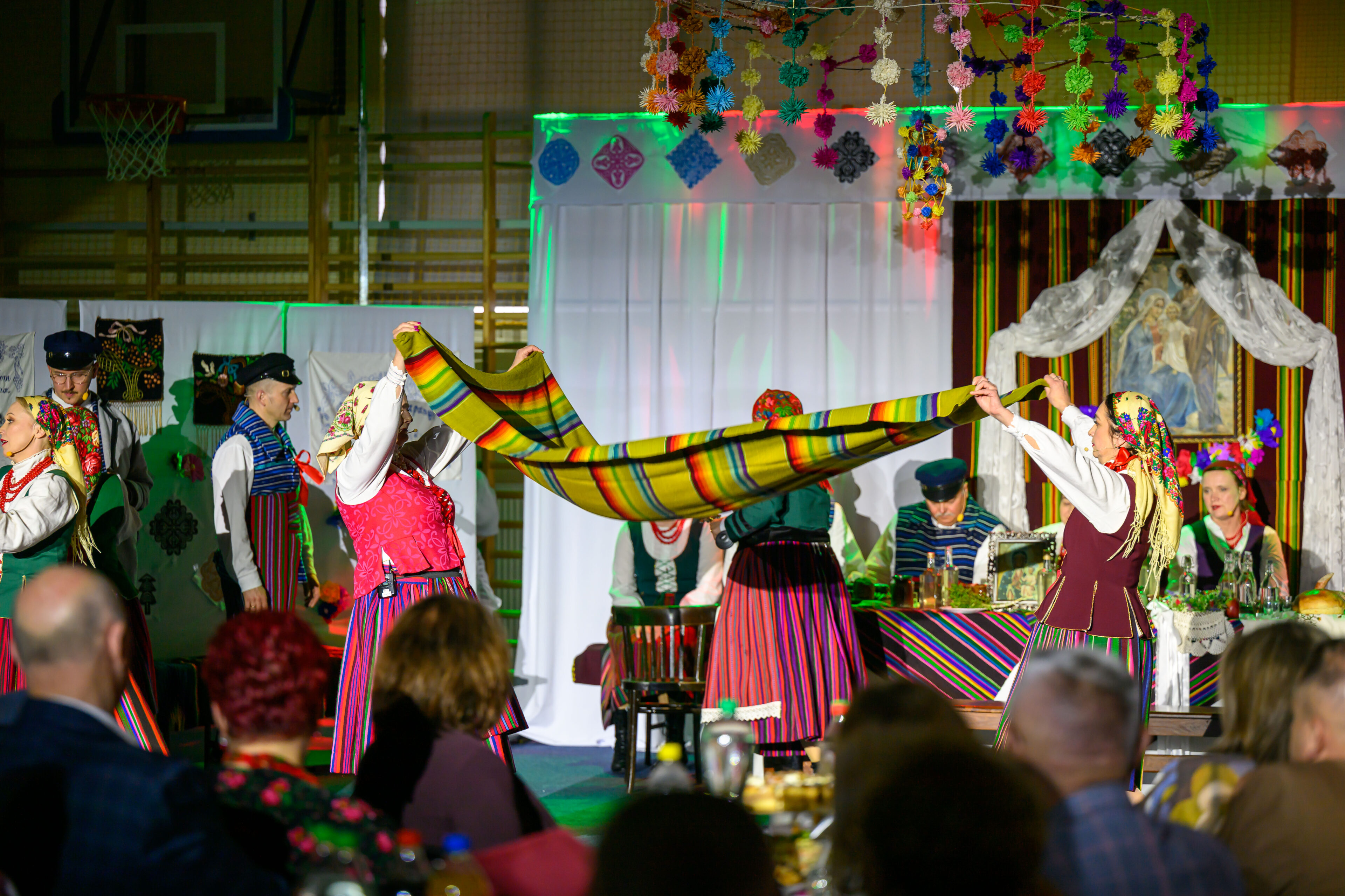 Spektakl przeniósł widzów w czasy dawnych, dziś już rzadko spotykanych obrzędów weselnych. Artyści w barwny i autentyczny sposób zaprezentowali kolejne etapy tradycyjnego wesela – od przygotowań, przez ceremonię, aż po wspólne świętowanie. Nie zabrakło ludowych strojów, przyśpiewek oraz charakterystycznych zwyczajów, które niegdyś stanowiły ważny element życia społecznego regionu.