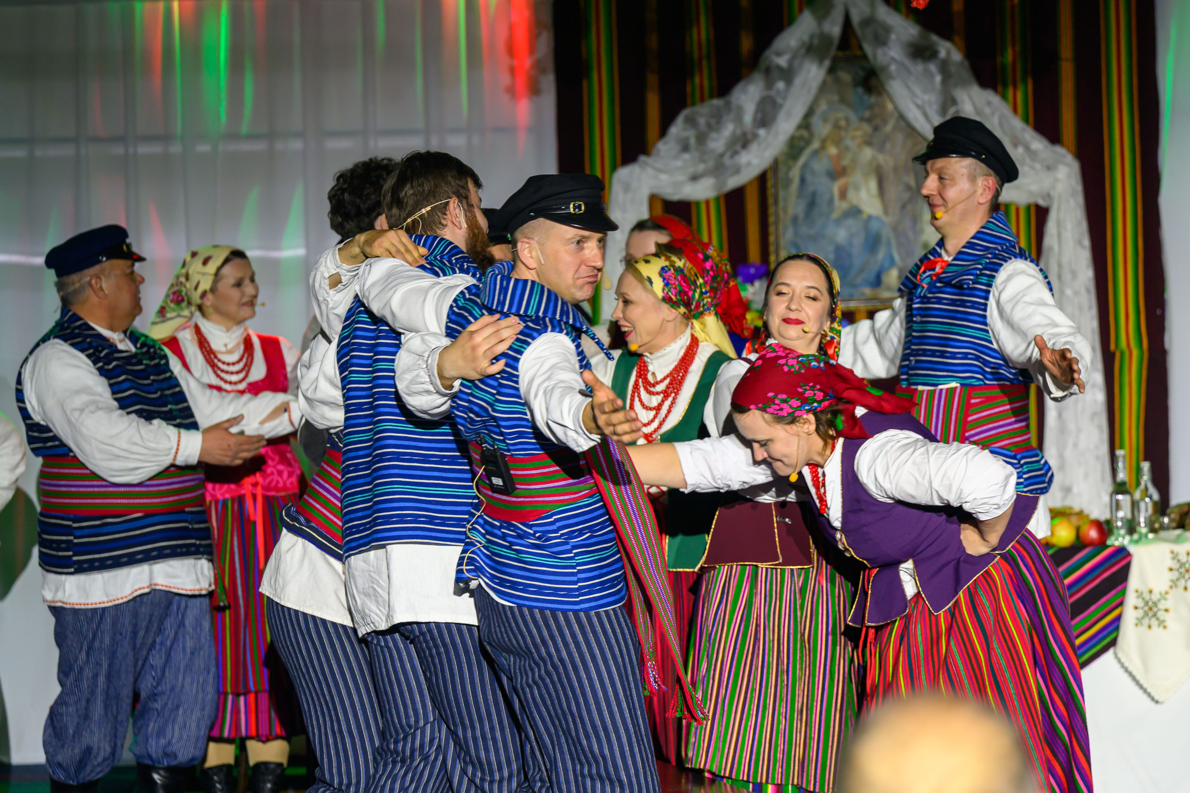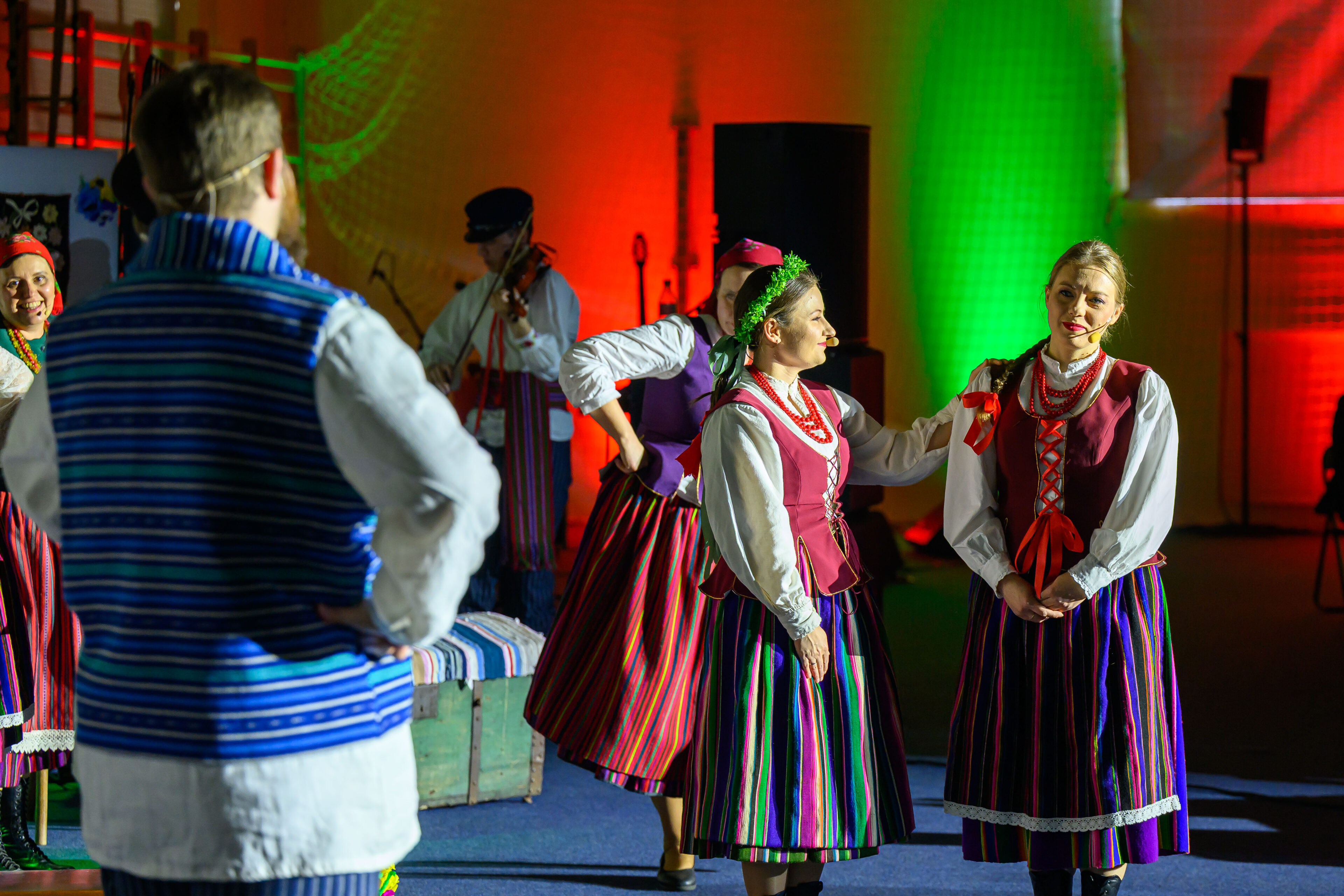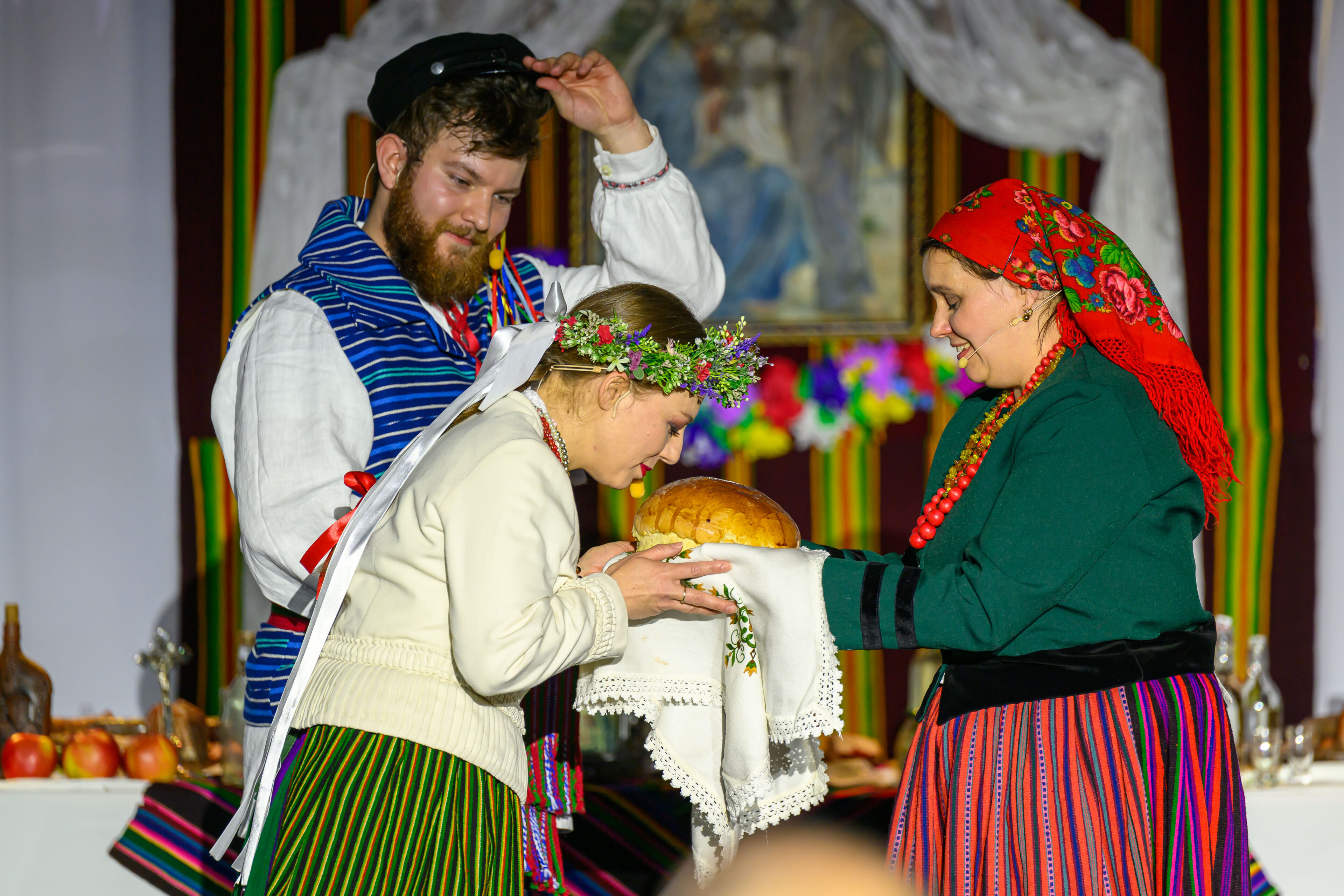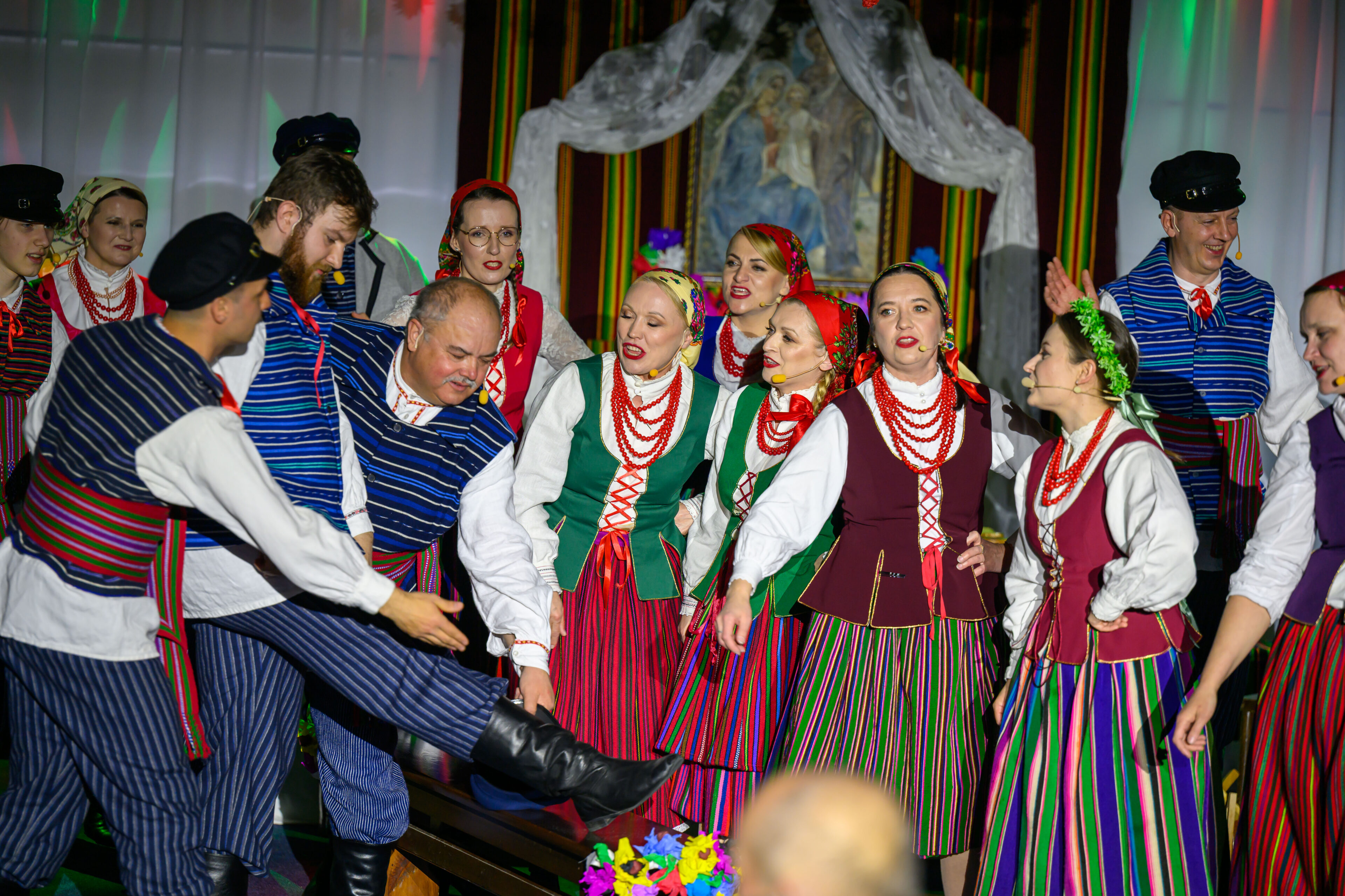 Spektakl przeniósł widzów w czasy dawnych, dziś już rzadko spotykanych obrzędów weselnych. Artyści w barwny i autentyczny sposób zaprezentowali kolejne etapy tradycyjnego wesela – od przygotowań, przez ceremonię, aż po wspólne świętowanie. Nie zabrakło ludowych strojów, przyśpiewek oraz charakterystycznych zwyczajów, które niegdyś stanowiły ważny element życia społecznego regionu.